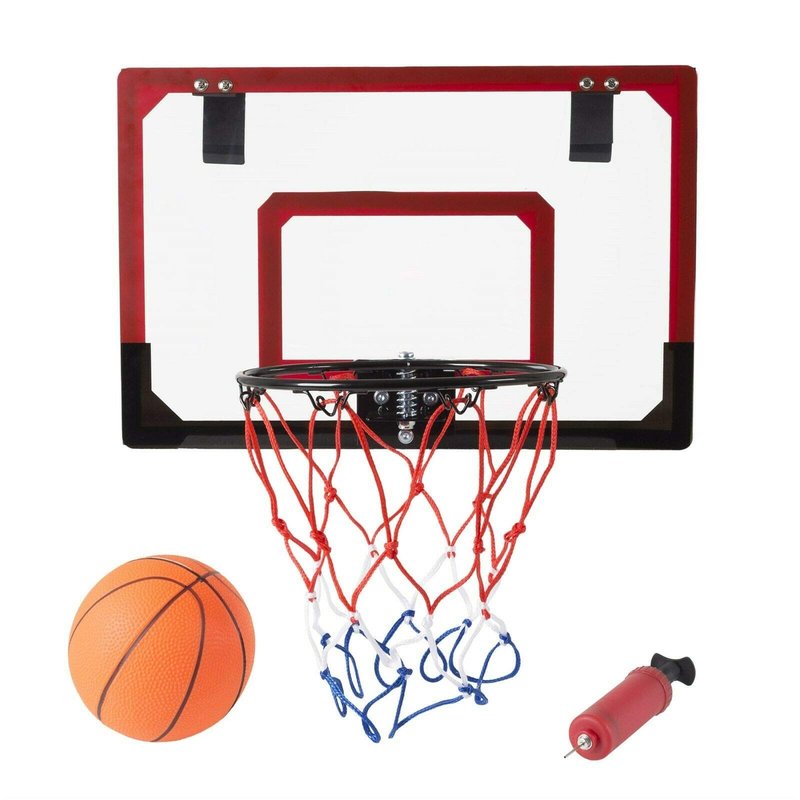 Product Details: The Over The Door Mini Basketball Hoop by Hey! Play! gives you the real basketball experience, whether you are playing a game in your room, or simply shooting hoops at the office. The hoop is easy to set up and easy to play. With a breakaway spring rim, you can dunk, shoot 3-pointers or practice your foul shots, and you get the same action as with a life-size basketball hoop. 1 Basketball Hoop 1 Basketball with pump Dimensions of backboard: 17.75 x 11.75 inches Spring action rim Foam padded mounts on the backboard Backboard: Clear Polycarbonate Assembly required