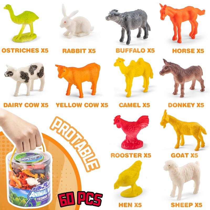 Farm animal toys: This plastic farm figurine has 12 unique types, including a total of 60 ostriches, rabbits, buffaloes, horses, dairy cows, yellow cows, camels, donkeys, roosters, goats, hens, sheep. You can spend pleasant time with your children and build a fun farm animal