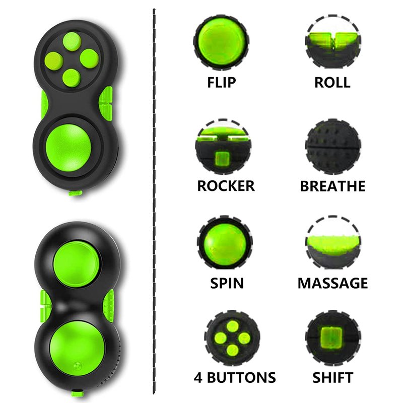 - 🎮 Fidget Controller Pad Toy 8 New Improved Functions:① A clickable rotatable joystick;② 4 clickable buttons (2 audible and 2 silent);③ Gear roller;④ A grip textured massage roller; ⑤ A clickable switch, ⑥ A spinnable dial; ⑦ A spring loaded slider;⑧ A grip textured section.