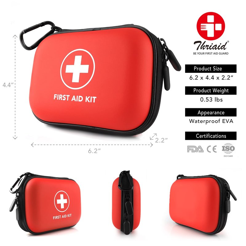 - HIGH QUALITY FIRST AID CASE ▶ 6.2" x 4.4" x 2.1" compact size, 0.53 lbs lightweight, the surface is made of premium waterproof eva material, the hardness of the case has been enhanced to make it more tough and durable. Premium double zippers and bonus carabiner increase convenience for outdoor activities. It has just the right size so it fits anywhere in your RV, atv, yacht, boat, jeep, bike or motorcycle.