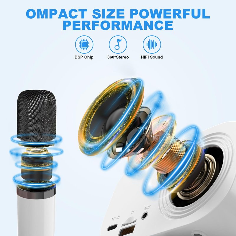 - 【360° Surround Sound】- Enjoy a live concert experience with our mini karaoke machine's high-power speakers, which deliver enhanced stereo sound and rich bass with 360° surround sound. This superior sound quality transforms every sing-along into an immersive and enjoyable event for both kids and adults.