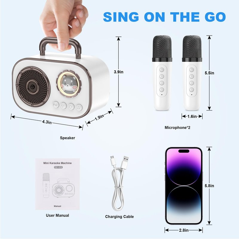 - 【Portable & Long-Lasting】- Featuring a cute and compact design, this portable karaoke machine is easy for kids to carry around. With a 1000mAh battery in the speaker and 800mAh batteries in the microphones, you get 3-4 hours of playback after just 2 hours of charging, ensuring hours of uninterrupted fun at home or on the go.