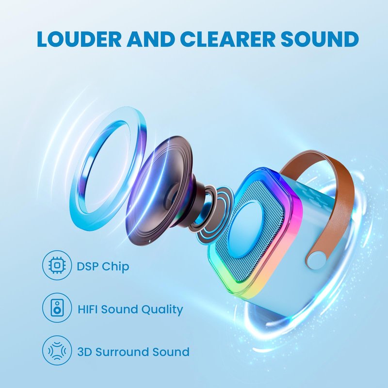 - Seamless Bluetooth Connection: This karaoke machine comes with speaker and wireless microphone that automatically connect to each other upon startup. Bluetooth 5.3 technology ensures instant pairing, stable connection, and an impressive range of 50 ft without obstacles. Perfect for parties and gatherings! Mini but powerful and loud, let you stay always from complex links and cables