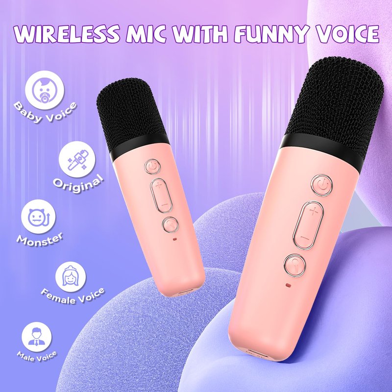 - SUPERIOR SOUND QUALITY: Portable kids mini karaoke machine with 2 wireless microphones.Despite its cute size, it is powerful and loud! Equipped with high performance audio drivers and advanced digital signal processor, it provides you with clear sound and perfect singing experience, let your kids love singing from now on!