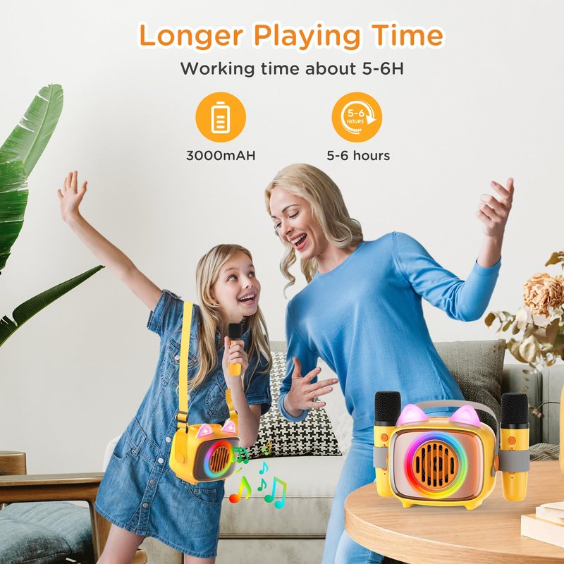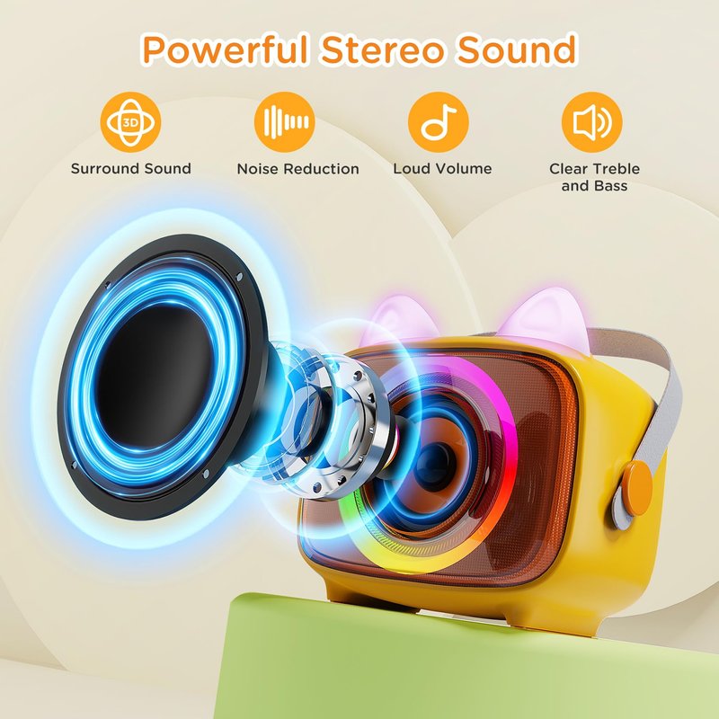 - 【Excellent Stereo Sound】This mini karaoke machine sounds amazing! The karaoke machine with a microphone combination of high-performance audio drivers and advanced digital signal processors ensures excellent stereo sound quality. The 3D surround sound effects and deep bass provide a truly immersive experience, making children and parents feel like they're right in the middle of the music and enjoy the fun of music