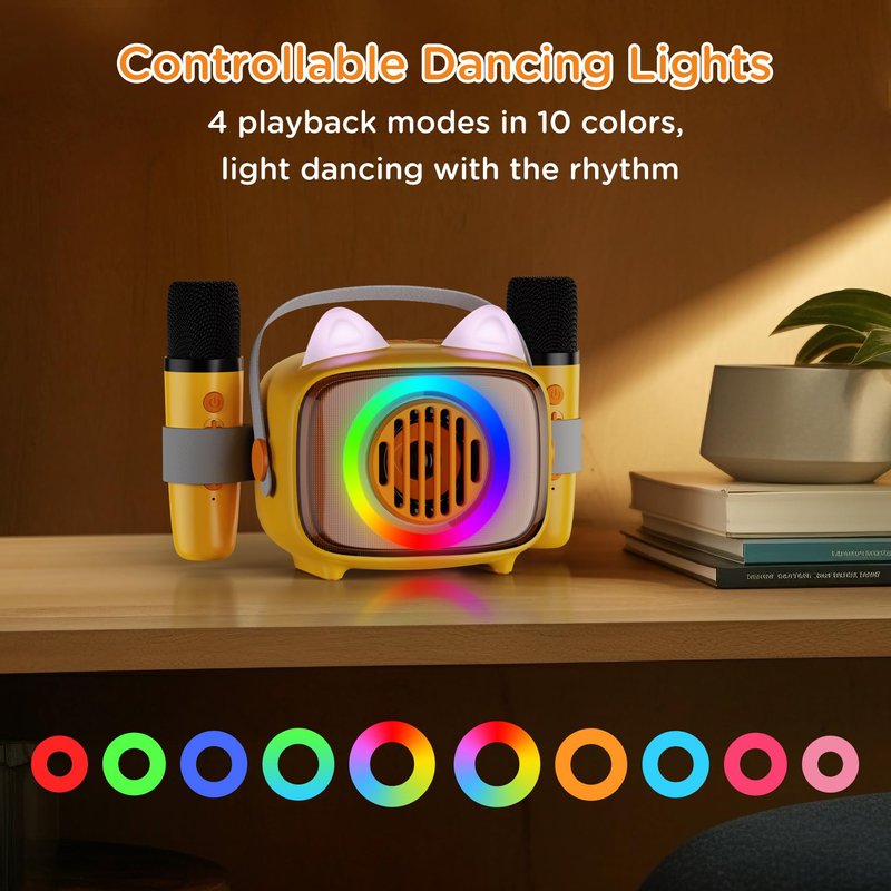 - 【Colorful Dynamic Lights】The karaoke system for kids also offers fun features. It has 4 lighting modes and 10 lighting colors, with LED lights that dance to the rhythm of the music, creating a joyful atmosphere. The interesting lighting design on the cute cat ears creates a dynamic and visually engaging karaoke experience for kids, that's great for kids' parties