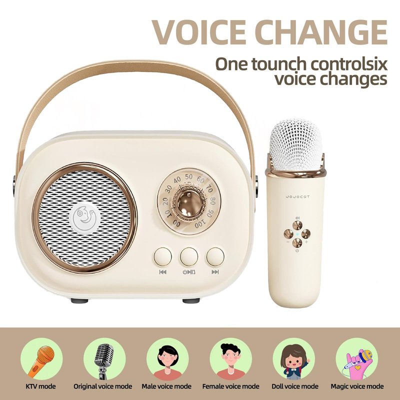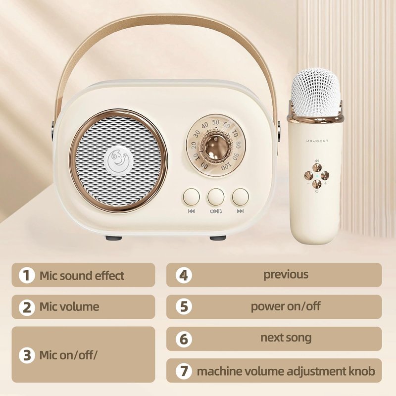 - Dual Microphone: Mini karaoke machine with 2 microphones, theinclusion six fun sound effects(Original, KTV Mode, Female, Male, Child, Magic), short press the MIc On/Off button andswitch between the original voice or accompaniment modealternately
