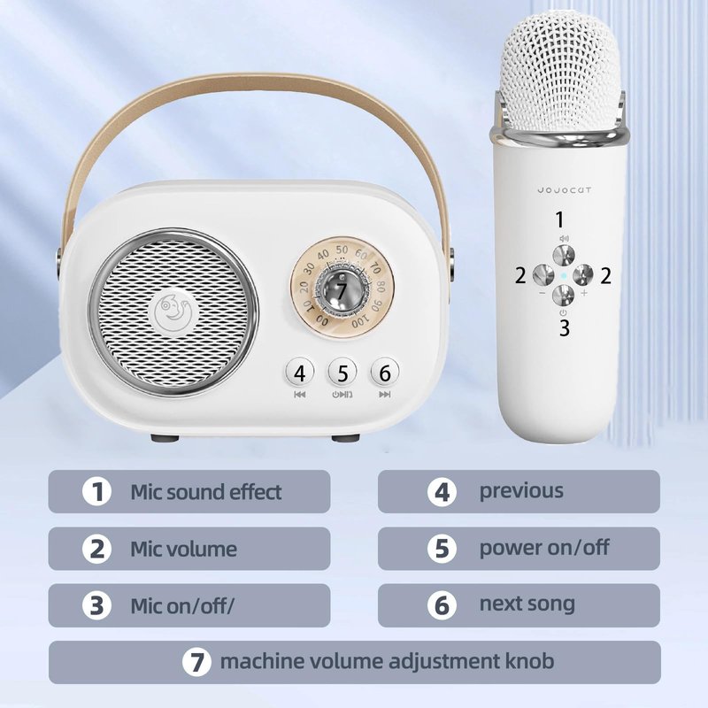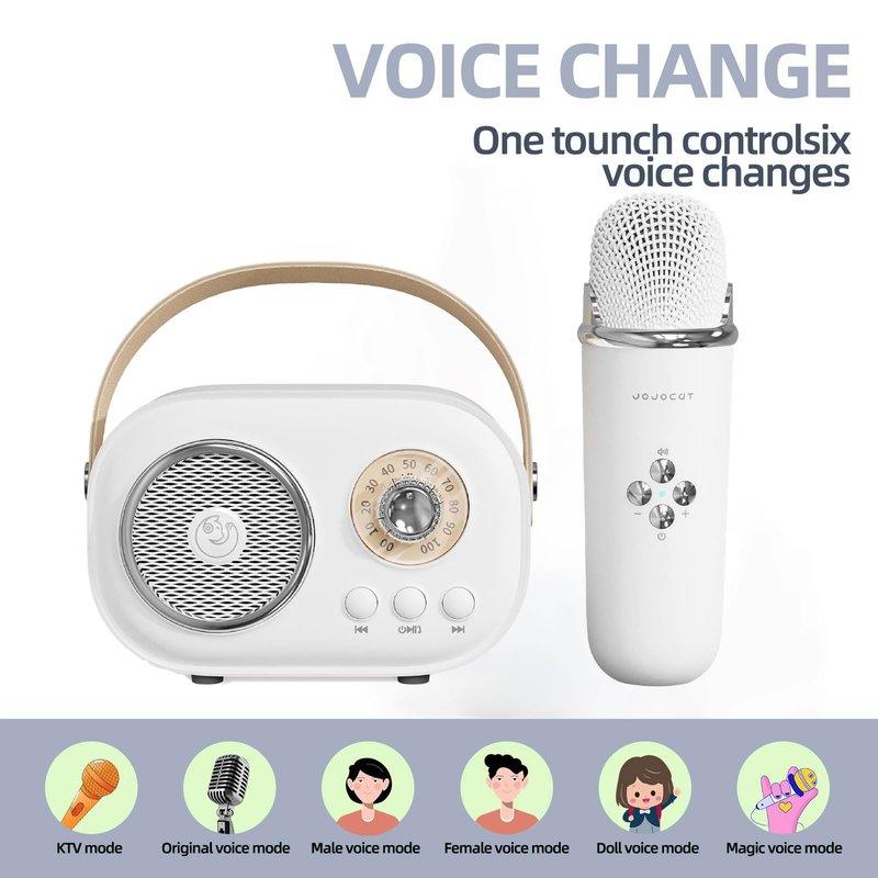 - Dual Microphone: Mini karaoke machine with 2 microphones, theinclusion six fun sound effects(Original, KTV Mode, Female, Male, Child, Magic), short press the MIc On/Off button andswitch between the original voice or accompaniment modealternately