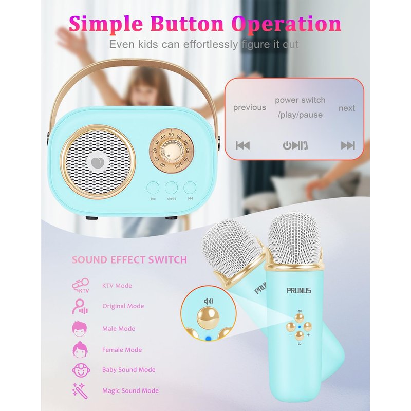 - Dual Microphone Stereo Sound Effect: This children's karaoke machine is equipped with a high-quality wireless microphone, allowing children to enjoy a unique singing experience. With unique sound settings (original, KTV mode, female voice, male voice, children's, magical sound effects), it helps children better showcase their singing talents. With simple operation, you can easily switch between original voice and accompaniment mode