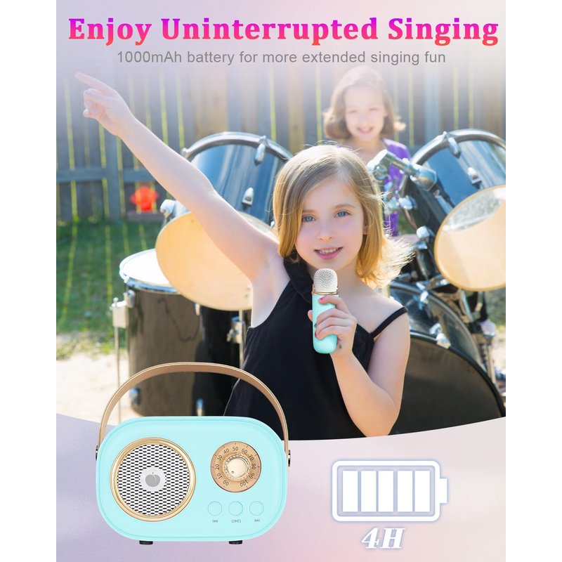 - Your Handheld KTV: The speaker’s palm size (size: 4.1 x 2 x 2.8in, weight: 0.6lb) and elegant handle make it incredibly easy to carry wherever you go. Whether in living room, backyard or neighbor’s home, party will start right away. Comes with a type-C charging cable, which can be used to charge either the speaker or microphone for kids. With a single charge, enjoy up to 4 hours of playtime for the car karaoke and unpowered cabinets.
