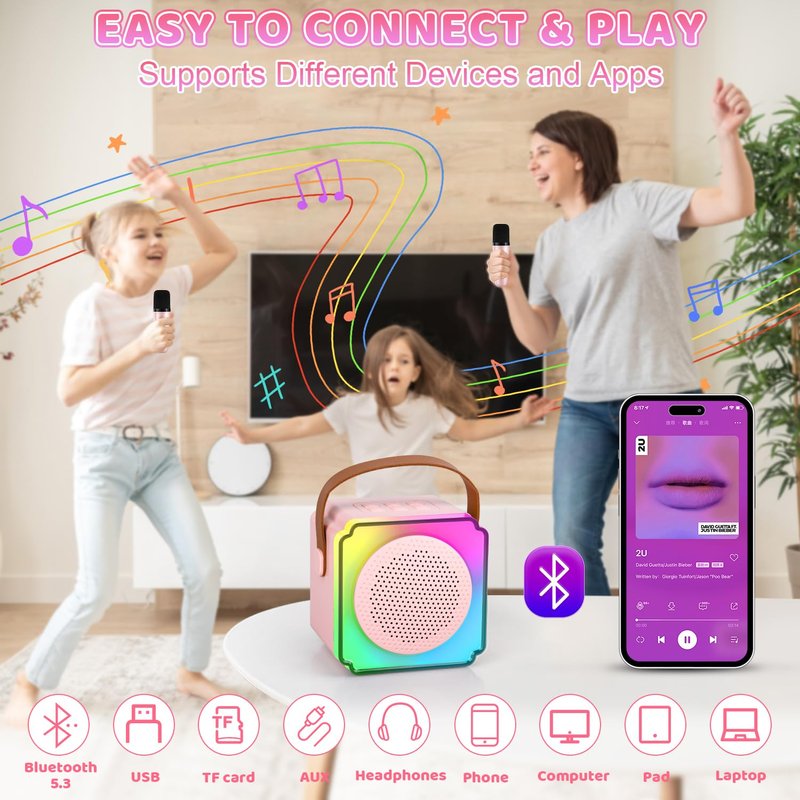Mini Karaoke Machine for Kids,Bluetooth Light Up Speaker with 2 Portable Microphones Wireless,Kids Karaoke Machine Toys Gifts for kids 3-12 Home Party Gifts (Pink 2 Mics)