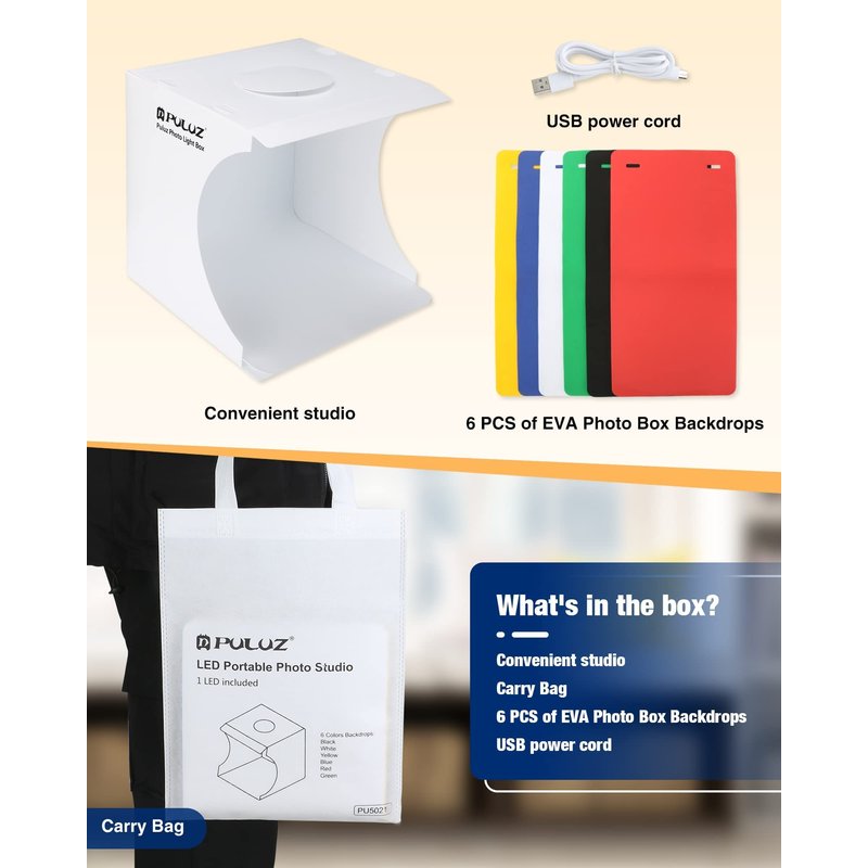 Ideal for product on-line sellers, professionals, and hobbyists, the photo studio promotes high-quality images and saves space and time with its convenient portability and quick set-up.
