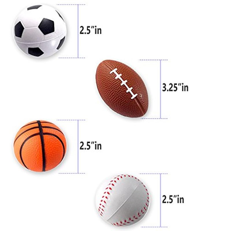 - SET OF 20 SPORTS STRESS BALLS: Our foam sports stress balls are suitable for individuals of all ages and can be used in various settings. Set consists of 4 different ball games: 5 basketball, 5 baseball, 5 football, and 5 soccer. All of your anxiety will be taken out on the stress ball. Size varies by ball with average size being 2.5 inches.