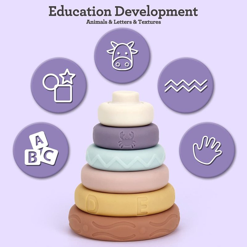- STEM Early Development - Our ring stacker is a thoughtful sensory toys for babies. Include animals, shapes, letters and textures for baby early knowledge learning. It’s not only exercise children’s hand-on ability and creativity. Also develop kid’s color perception, digital cognition and shape recognition while they playing stacking game.