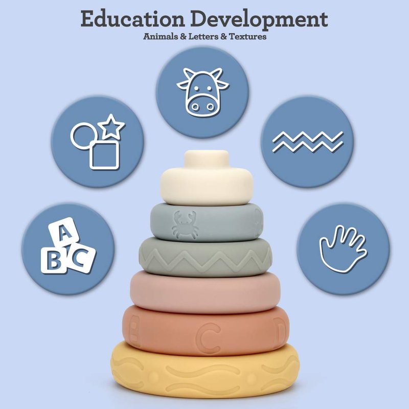 - STEM Early Development - Our ring stacker is a thoughtful baby sensory toys for babies. Include animals, shapes, letters and textures for baby early knowledge learning. It’s not only exercise children’s hand-on ability and creativity. Also develop kid’s color perception, digital cognition and shape recognition while they playing stacking game.