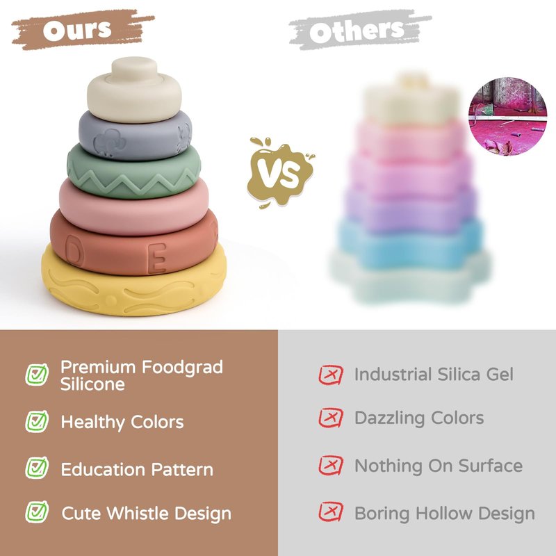 Are you still looking about early educational toy which is fun and safety? Are you still looking for a toy which boy and girl both like it? Our stacking toy is the most representative educational toys for children,include letter and patterns on the surface of the toy.Develop children’s hand-on ability,color perception,digital cognition and shape recognition when they enjoy push down the building and remade. INFORMATION U SHOULD KNOW: Product Name:Stacking Rings Material: Food-grade Silicone Number of Rings:6 Product Dimensions: 3.9”L*3.9”W*4.7”H Age: over 6 months old
