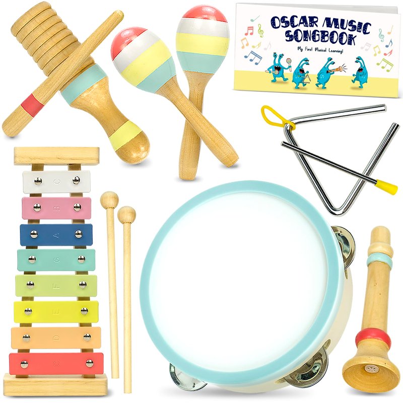 - COMPLETE INSTRUMENT ENSEMBLE: From tapping out tunes on the xylophone for toddlers 1-3, our baby Montessori toys are arranged in warm and natural colors. It includes an 8-tone xylophone with mallets, a tambourine with cymbals, two maracas, a trumpet, a triangle with striker, and a wood sounder. These kids musical instruments provide everything your toddler needs to create beautiful melodies and explore different tones and rhythms. Let their imagination soar with hours of musical play.