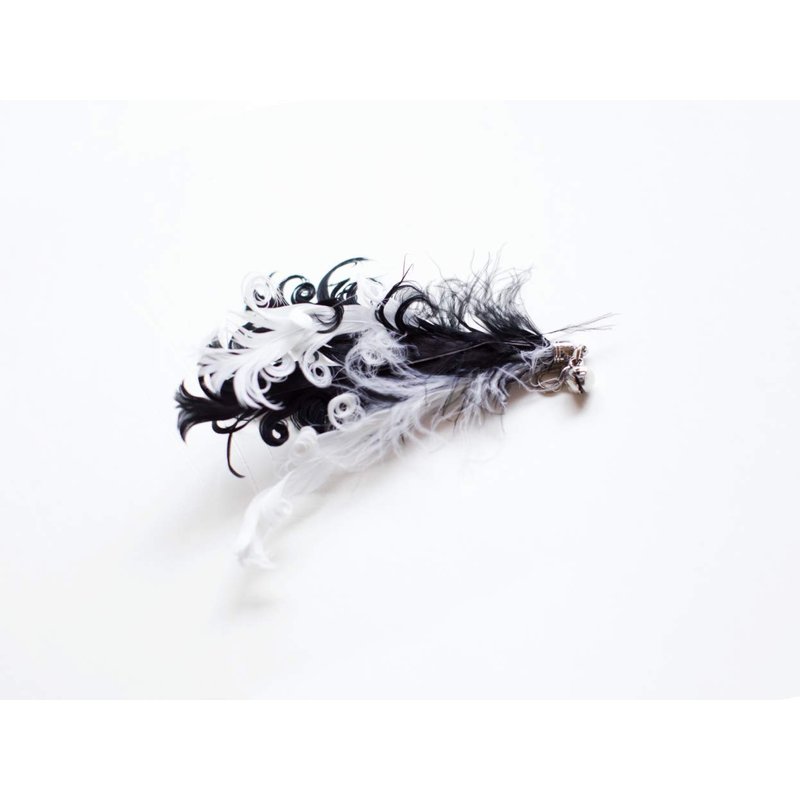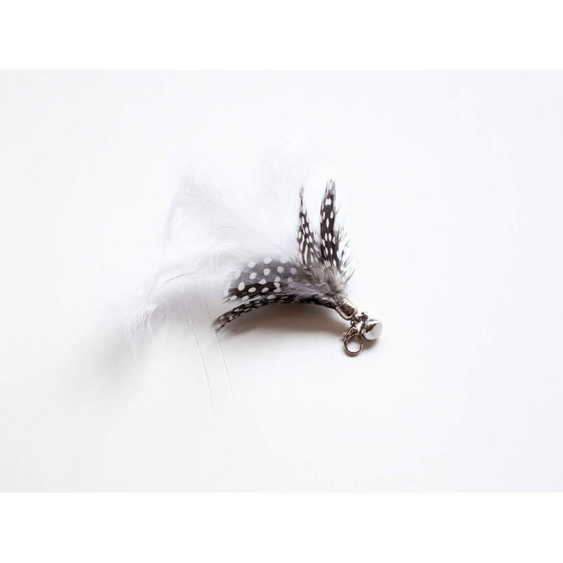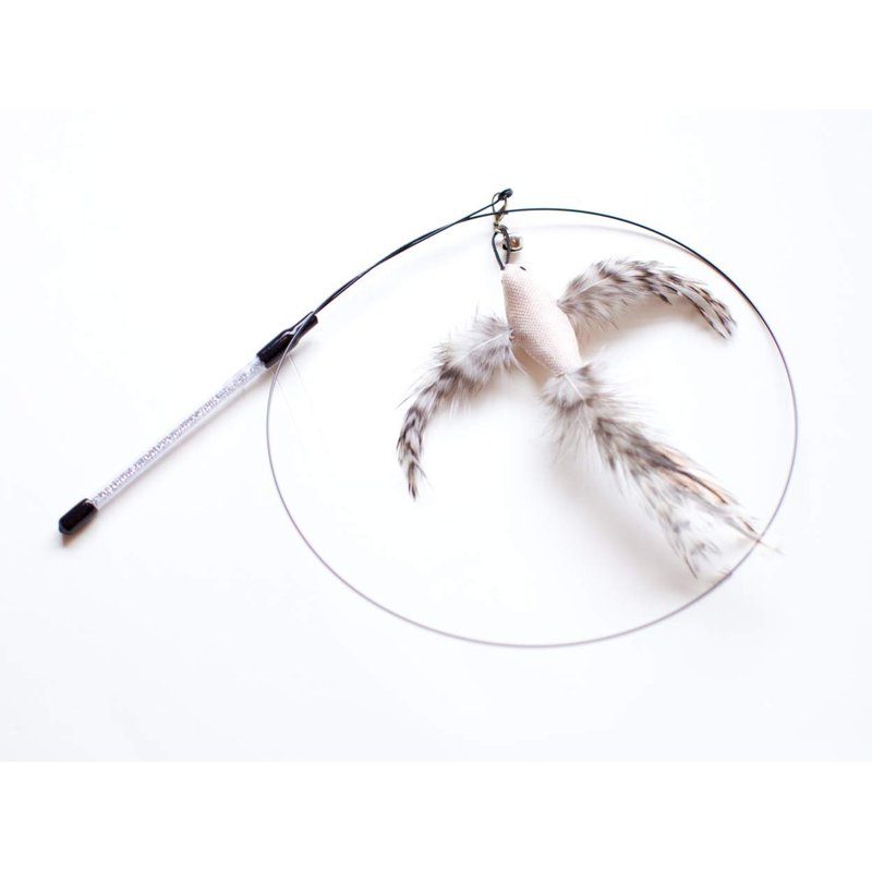 The product contained one wand teaser and comes with three changeable toys. A bland and white feather teaser toy A fish shaped fluffy teaser toy A white feather shaped toy