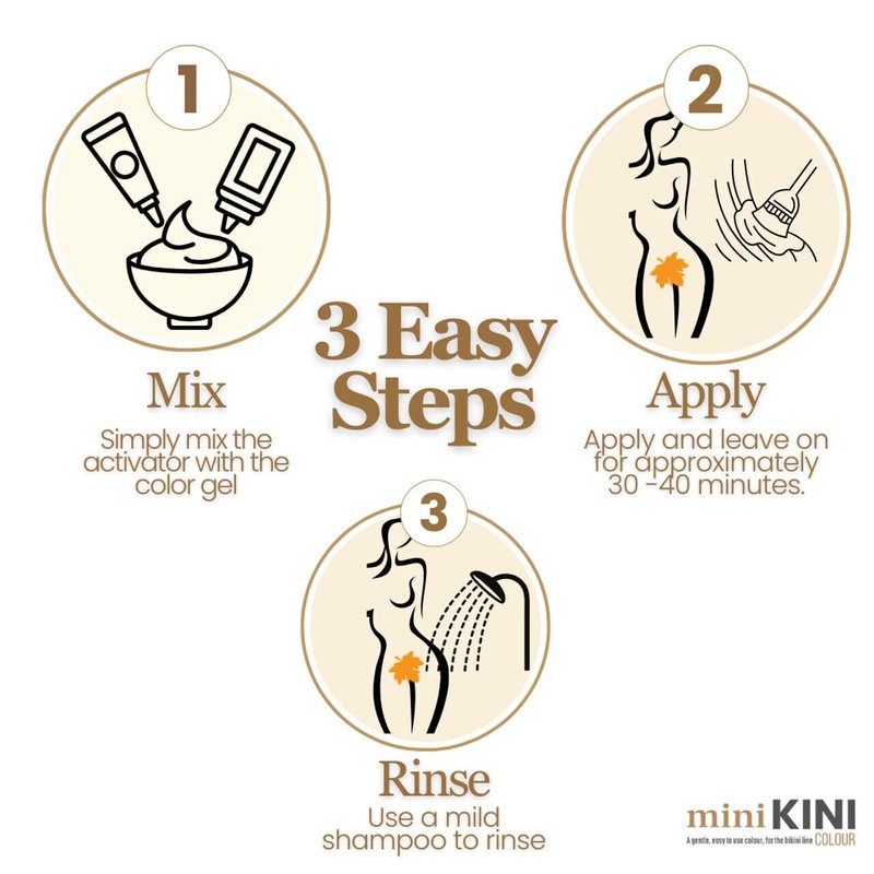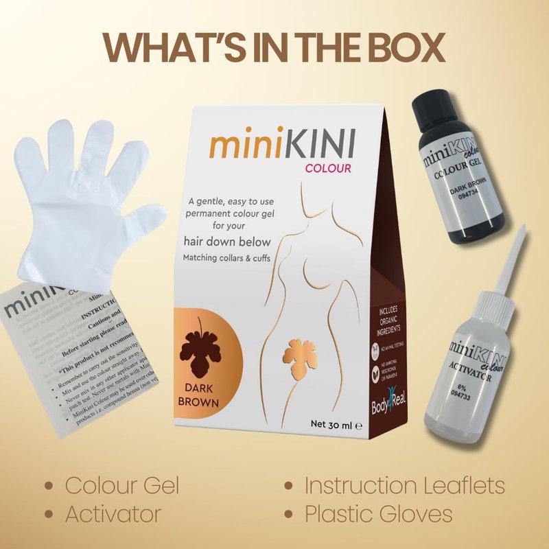 MiniKini Permanent Bikini Hair Dye Coloring Kit Dark Brown Dark Blonde Black Long Lasting Result and VAJ-J VISOR Ladies Intimate Area Protective Shield Cover (Dark Brown, Minikini Dark Brown + Vajj)