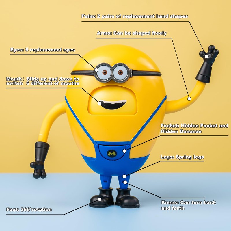 Specifications ●Age Range: 8 Years Old & Up ●Material: High-quality ABS+PVC ●Assembled Product Dimensions (L×W×H): 5.1 x7.8 x 2.5 Inches(13x20 x 8.5cm) ●Kit Includes: Jerry body x 1 Replacement eye x 6 Mouth x 3 Replacement hand x 2 pairs Display base x 1 ●Features: ①Hands-on assembly experience. ②Multiple types of eyes,hands and mouths,Flexible arms for different poses,Independent base for various display needs,allowing fans and collectors to personalize their display and relive their favorite movie moments! ③Despicable Me 4 toy model, official movie 1:1 replica.Team up with your child to build a oneof-a-kind Minion for the ultimate assembly adventure! Don't get in Jerry's way!He will swallow anything in his way without hesitation! Collect all 5 Minions:Don't miss out on the chanceto own a piece of Minion history, Perfect for collectors, fans, and kids alike, these figures are more than justtoys-they are a celebration of the beloved "Despicable Me" universe.