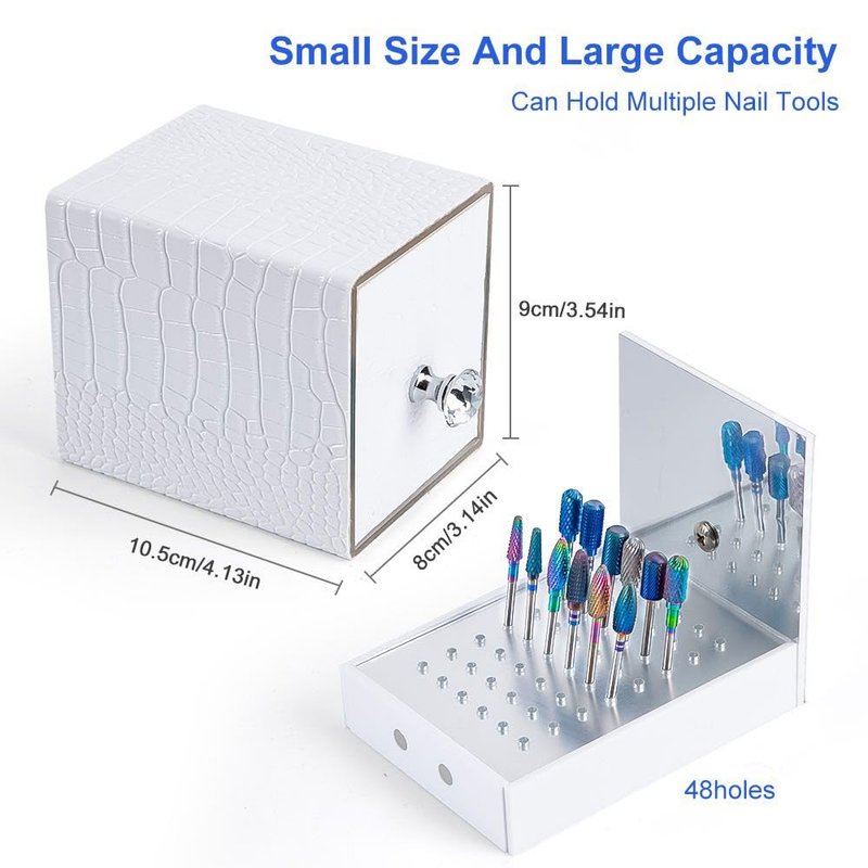 - Acrylic Construction: The nail drill bit holder is made from high-quality acrylic, ensuring durability and a transparent display for easy identification and access to your various nail drill bits. 48 Holes: With a total of 48 carefully designed holes, this organizer accommodates a variety of nail drill bits, keeping them neatly organized and easily accessible, enhancing your efficiency during manicure sessions.