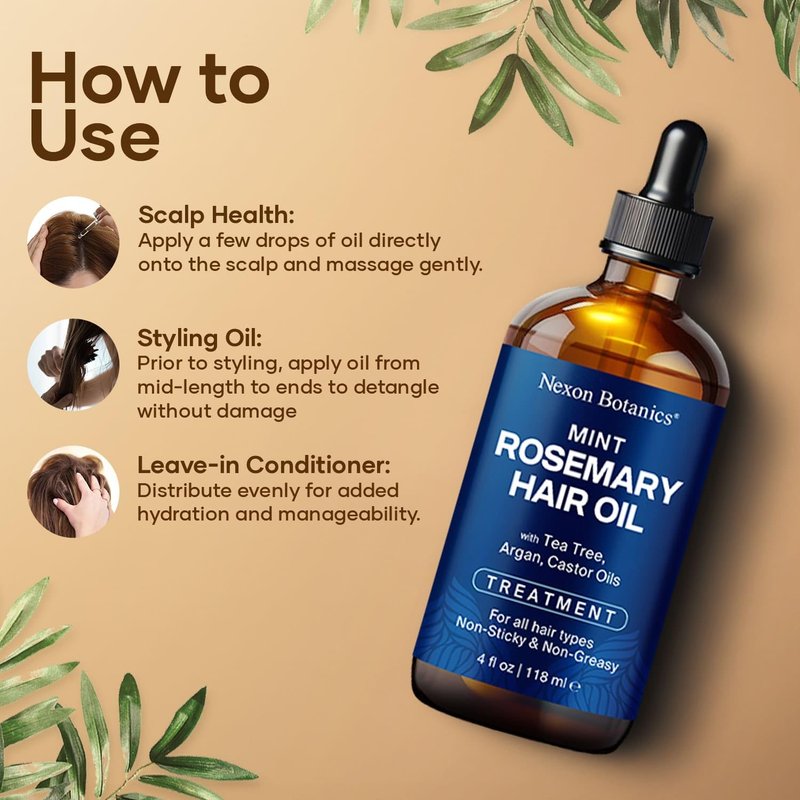 - Rosemary and Mint Oil for Hair Growth: This hair treatment oil is infused with pure plant extracts like Rosemary, MCT, Castor, Jojoba, and Argan oils for hair nourishment and growth.