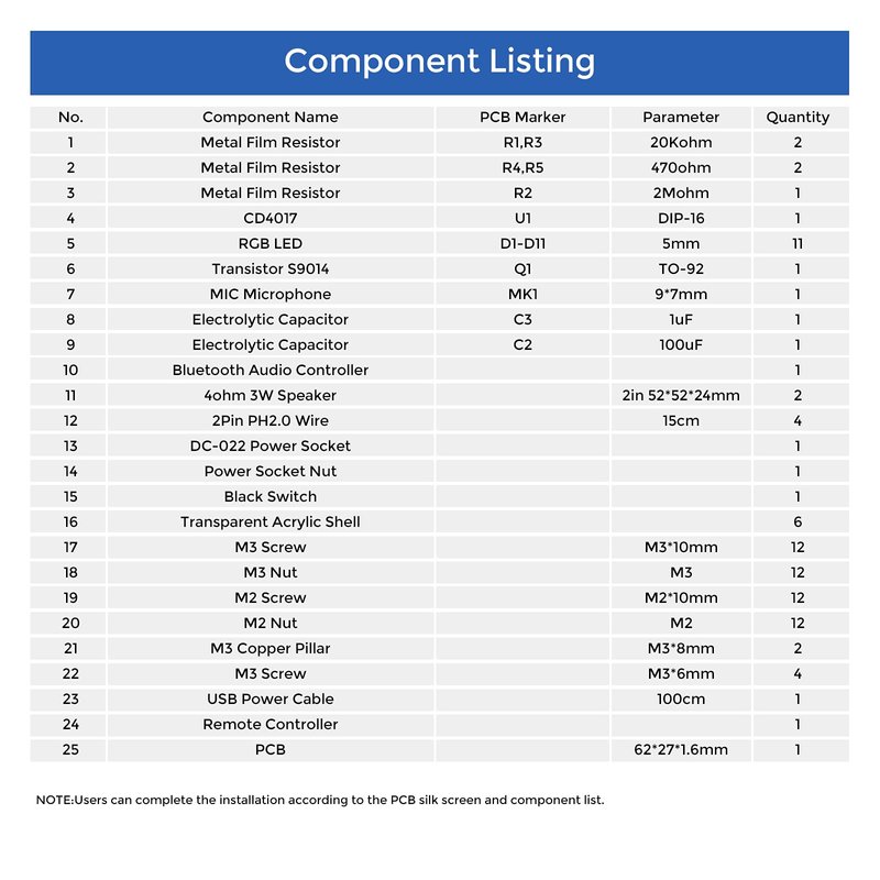 You Wanna Experience Fantastic Electronics Soldering?You /Your Students Are Interested in DIY Electronics Projects?Wanna Spark & Encourage Child's Talents & Passions and Keep Electronics Learning Interesting and Fun?This Ingenious Ḅḷueṭooṭḥ-compatible Speaker Kit DIY for It. Its purpose is to help you gain more knowledge of electronics in fun. You are the music producer, make these DIY kits to be a Electronic Sound Amplifier with Beautiful Lights, which could be a gift, and also be used as a doorbell or an alarm.This Amplifier DIY Kit is suitable for Learning Electronics and Practice Soldering Skills for DIYers, Electronic Enthusiasts, STEM Students, Beginners, or Anyone Looking For A Neat Desk Model.What Will You Get?1. Easy-to-Assemble Fun LED Ḅḷueṭooṭḥ-compatible Speaker Kit:--This product comes to you is Component Kit needs to be installed to A Cool Transparent Box Speaker. It's helpful to improve the ability to solve practical problems through hands-on practice. In the meanwhile you can enjoy the fun from the DIY projects.--Easy to Assemble: The components' marker name clearly mapped and labelled on PCB Board makes it easy to assemble.