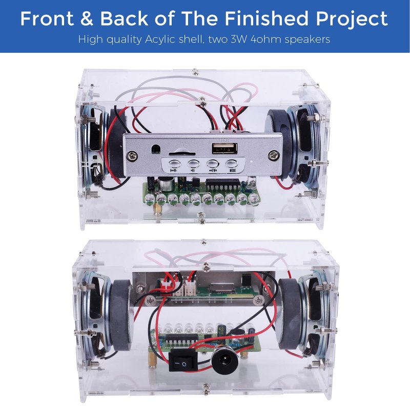 - 🎵【Bluetooth-compatible Amplifier DIY Kit】: The Soldering Project DIY Kits are used to installed to an electronic transparent stereo speaker with high-power speakers, colorful LED flashing lights and transparent Acrylic shell. Fun and entertaining, build your own bluetooth speaker by yourself, a cool project and challenging enough to be fun.