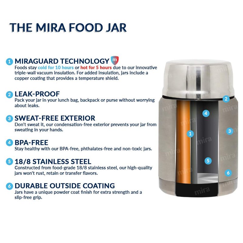 - Innovative Vacuum Insulation: Our highly rated thermos food jars use our MiraGuard Technology to keep food cold for 10 hours or hot for 5 hours. With our innovative technology, your thermos lunch box maintains inside temperatures for hours and prevents condensation from forming on the outside of the jar. Food jar is hand-wash only. NOTE: Please do not overfill the jar or store food in the lunch jar for more than 24 hours. Please do not over-tighten the lid and do not force it open.