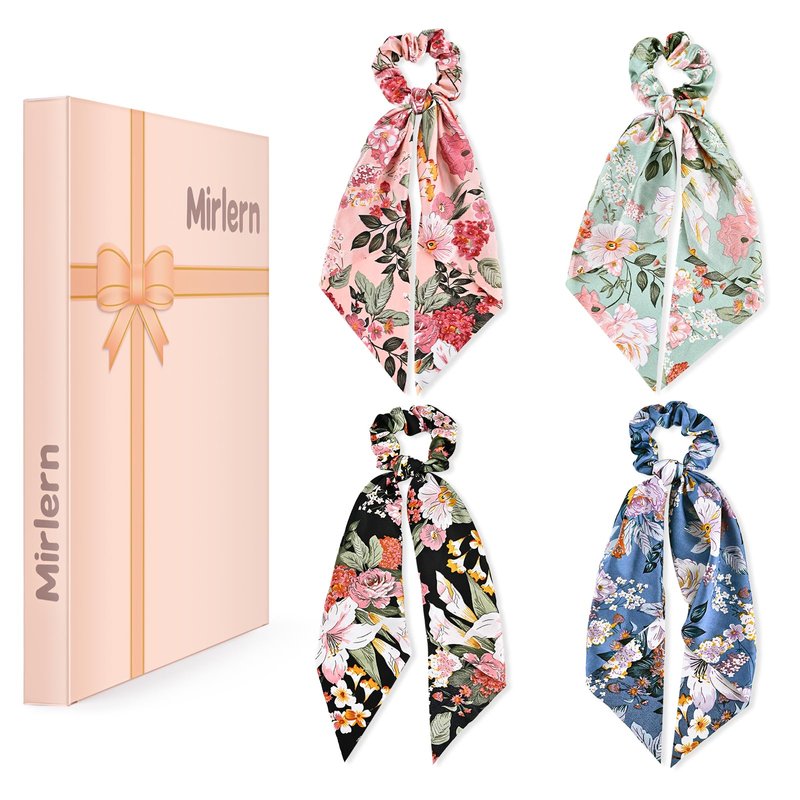 Mirlern 4-Piece Silk Satin Hair Scarf Scrunchies for Women Girls, No Damage Cute Hair Ties with Bow Ribbons Ponytail Holders Elastic Rubber Bands (Lily)
