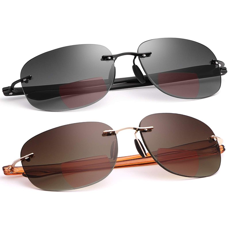 - Rimless Bifocal Reading Sunglasses - The Bifocal Reading Sunglasses has two visual areas. The top area is for distant vision. You can see the distance directly without having to remove your specs. The lower area is powered and convenient for reading indoors and outdoors. Perfect for outdoor reading and distance Viewing.