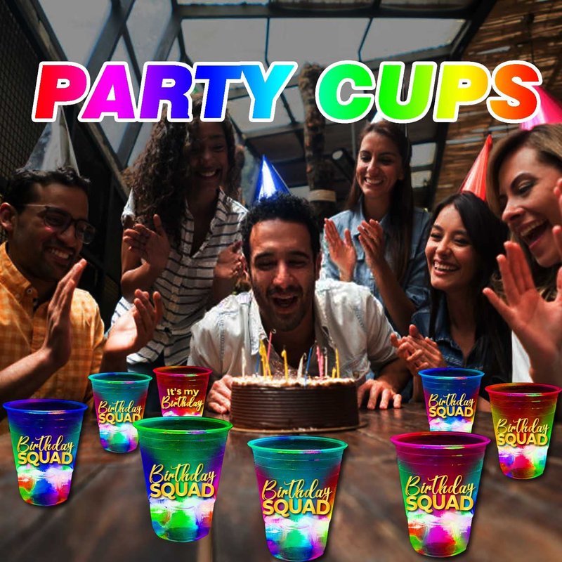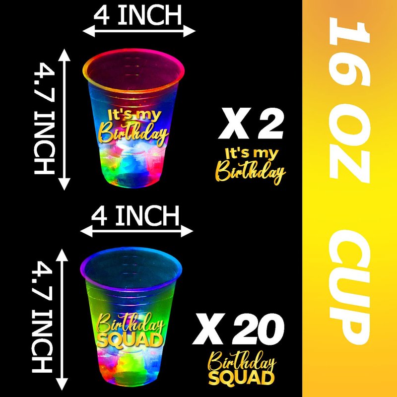 - Birthday Squad Party Cups: 2416oz plastic party cups with 22 Birthday Squad theme and 2 it's my Birthday theme, 24 flash color LED lights, 2 gold LED light, 24 waterproof stickers.