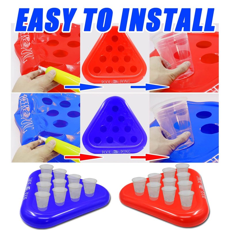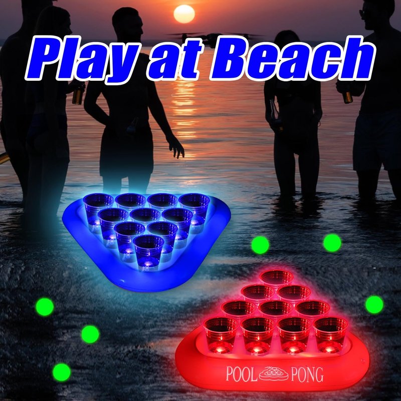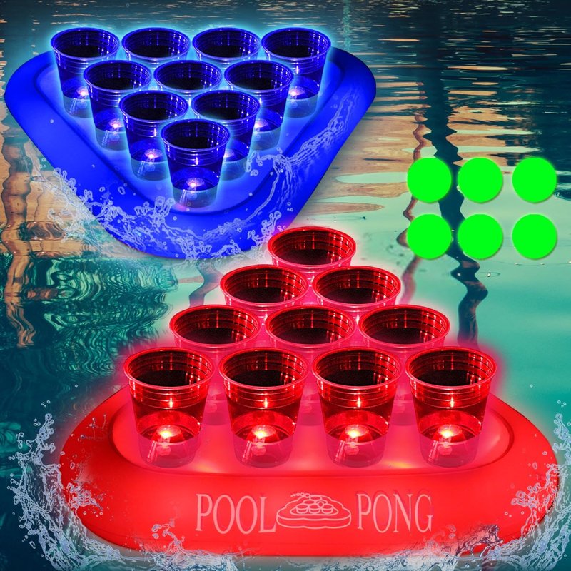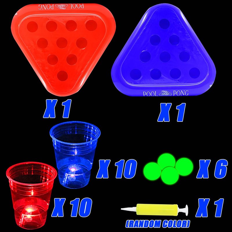 -Includs 2 inflatable pool float racks(red&blue), 20 plastic cups, 20 LED lights(10 reds&10 blues)glow pong X 6 sticker X20 (5cm waterproof ).
