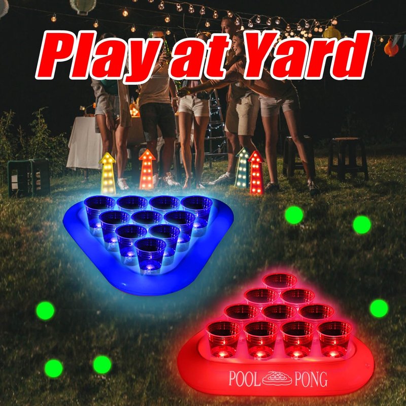 - 【Inflatable Floating Pool Toss Game Set】: Includs 2 inflatable pool float racks(red&blue), 20 plastic cups, 20 LED lights(10 reds&10 blues)glow pong X 6 sticker X20(5cm waterproof )