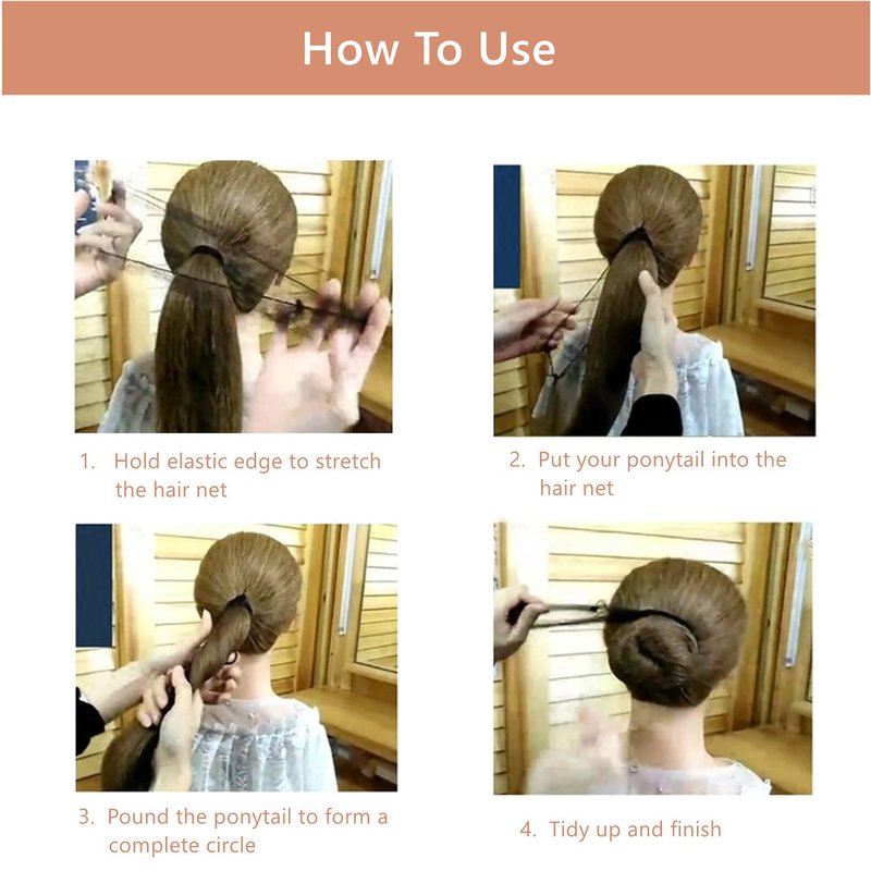 How to use 1.Hold elastic edge to stretch the hair net 2.Put your ponytail into the hair net 3.Pound the ponytail to form a complete circle 4.Tidy up and finish