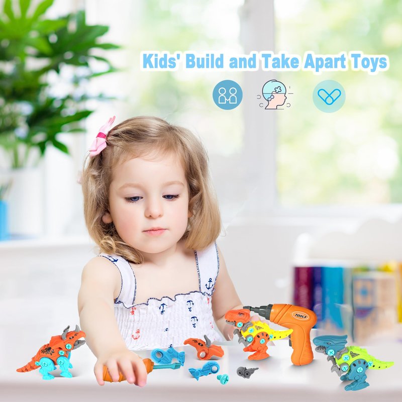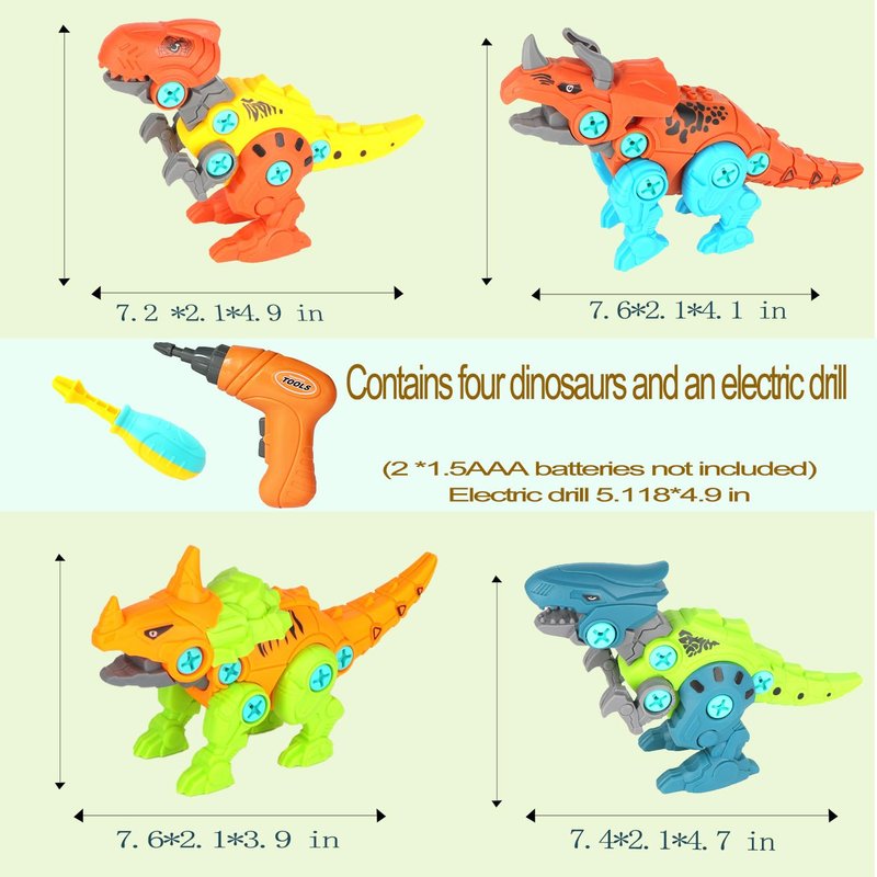 - 【4 Pack Take Apart Dinosaur Toys】The dinosaur building kit includes 4 kinds dinos: Tyrannosaurus Rex,Triceratops,One horned dragon,Velociraptor,and includes 1 electric drill toy, 2 interchangeable drill bits, 1 plastic screwdriver. Brilliant dinosaur set for dino enthusiasts. They are life-like and great for boys and girls aged 3 years old and up. The multi-color realistic design helps attract children's attention to freeing child's creativity and imagination.