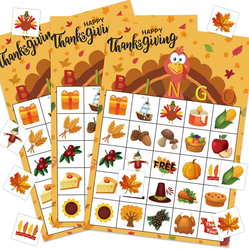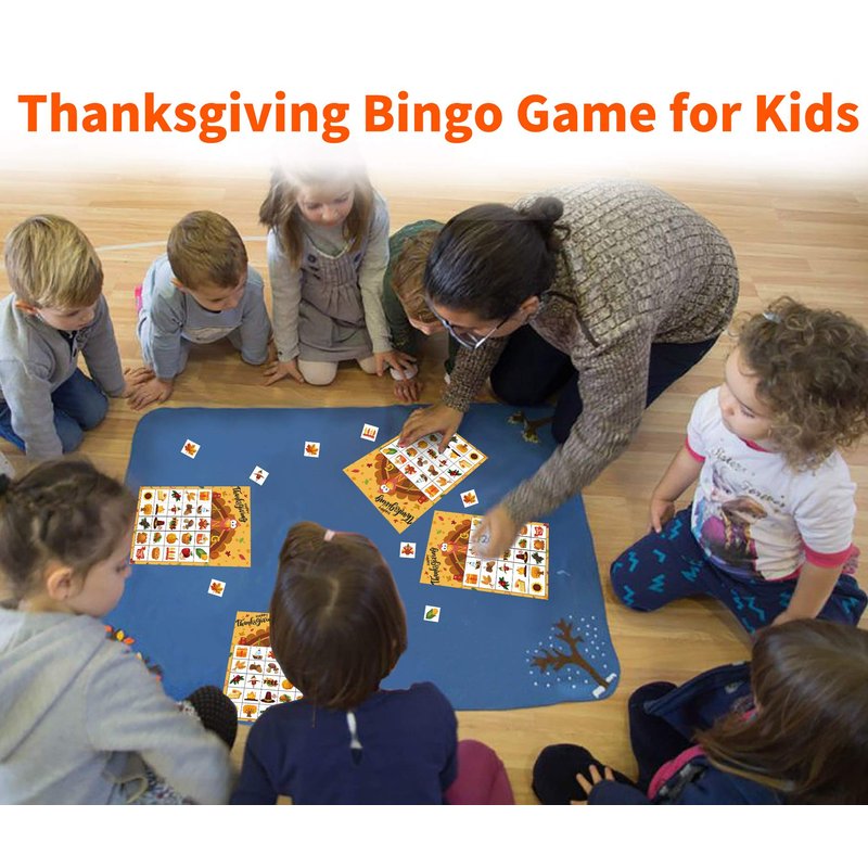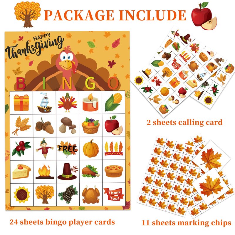 - THANKSGIVING BINGO SET INCLUDE:24Ppcs kids thanksgiving bingo player cards, 385 Pcs player chips and 2 Sheet caller cards.Support enough members to play with ,perfect family and memorable event games with you kids.Just enjoy it.