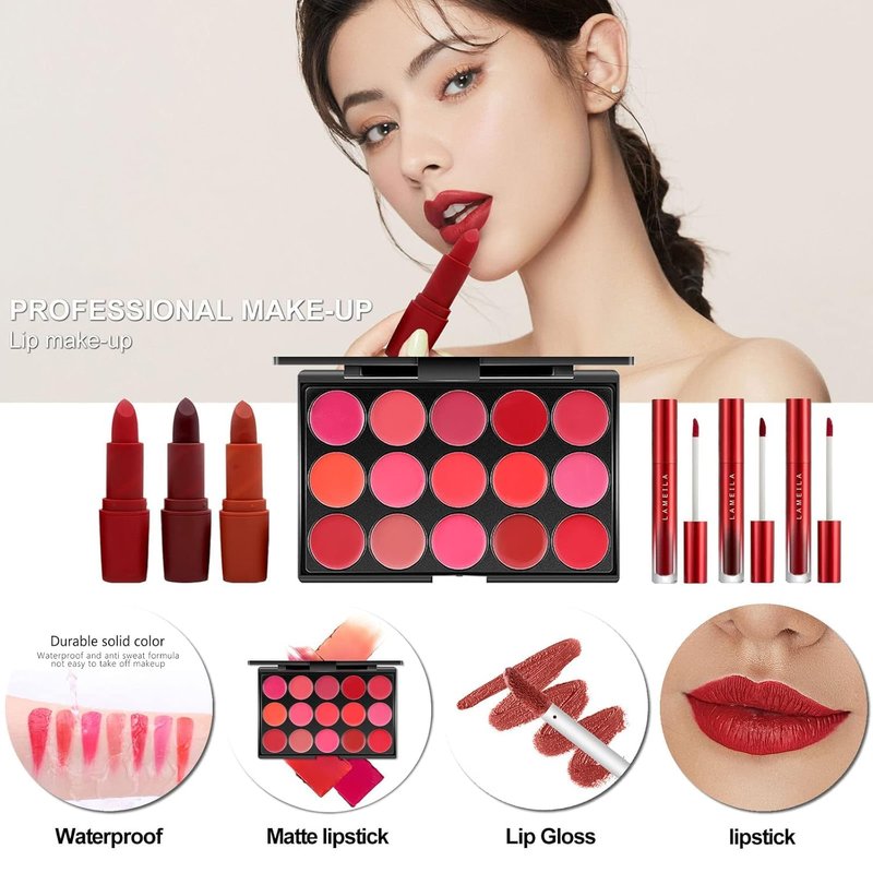 - đăAll In One Makeup SetăThis makeup set for girls contains: Lipstick,Lip Gloss,Lipstick Palette,Powder Case,Liquid Foundation, Blush Palette,Eyeshadow Palette,Mascara,Brow Pencil,Eyeliner, Contour Pen,Brow Sticker,Powder Puff,Makeup Brush Set,Cosmetic bag