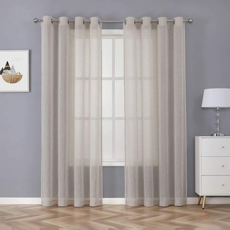 - What’s in the package: Each Package includes 2 sheer curtains with border, which are crafted of soft and sturdy linen textured fabric. Each curtain panel is easy to install and slide with 8 grommets on top, fit up to 1.6 inches diameter curtain rods.