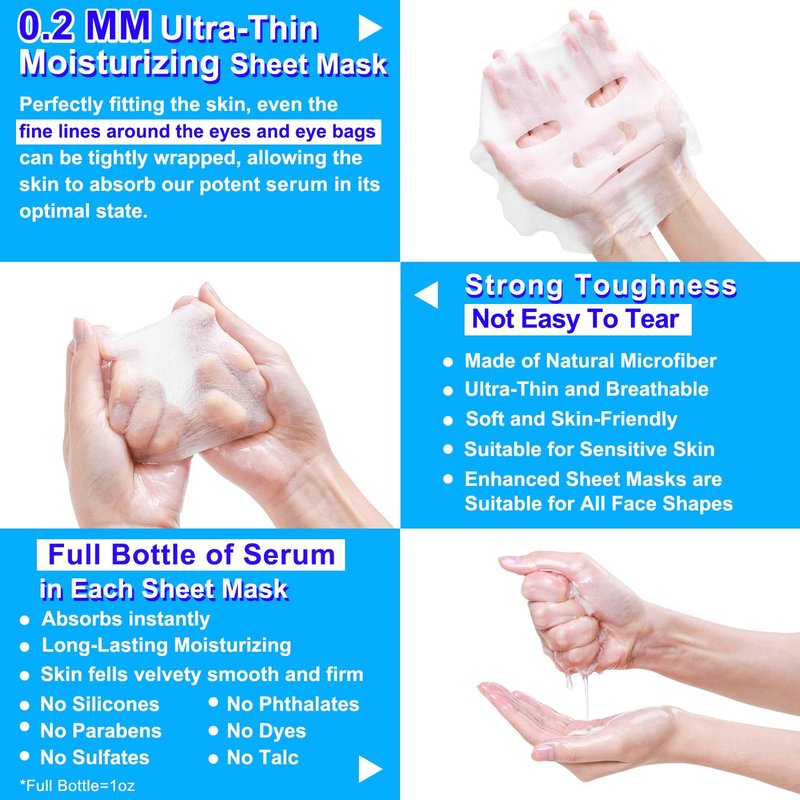 - 【Specially Formulated with Hydrolyzed Hyaluronic Acid In a Mask】peptide to instantly quenches skin deeply hydrates leaves skin supple and hydrated. In just a few minutes, these facial masks will boost your skin elasticity and firmness, so you can look more youthful day after day.