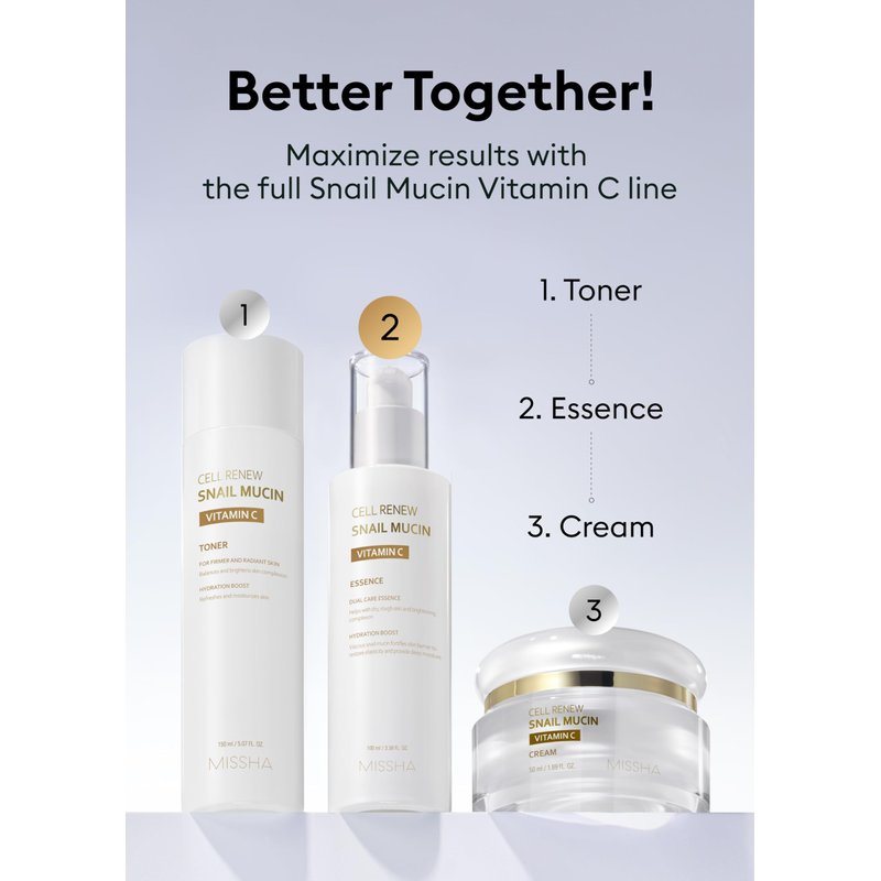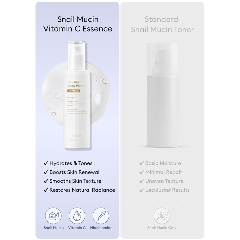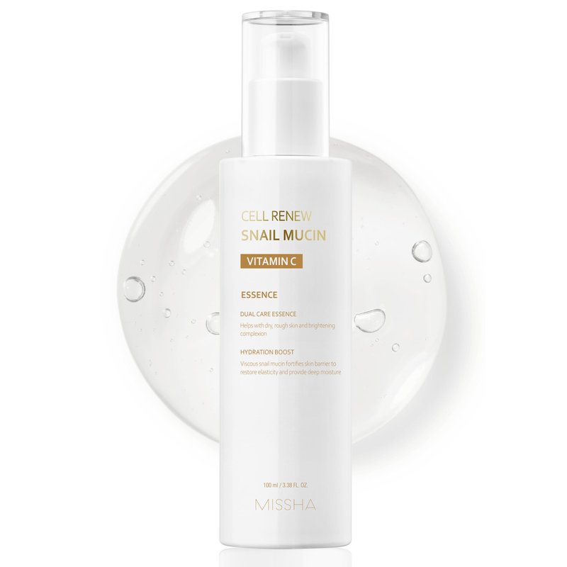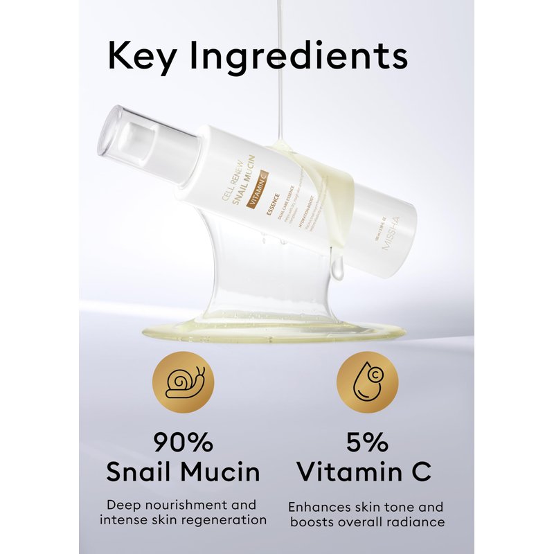 MISSHA Cell Renew Snail Mucin Vitamin C Essence Serum 3.38 Fl oz - Hydrating Korean Skincare for Glass Skin, Snail Mucin Serum for Improved Skin Texture & Complexion