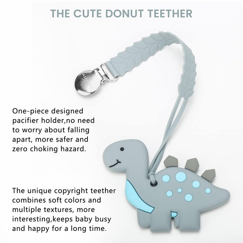 - One-piece Design: The safe, stylish, multifunctional baby silicone teether toys features one-piece design pacifier clip and colourful dinosaur teether design. No need to worry about falling apart, and there’s zero choking hazard. Help the baby teething to relieve the pain of teething