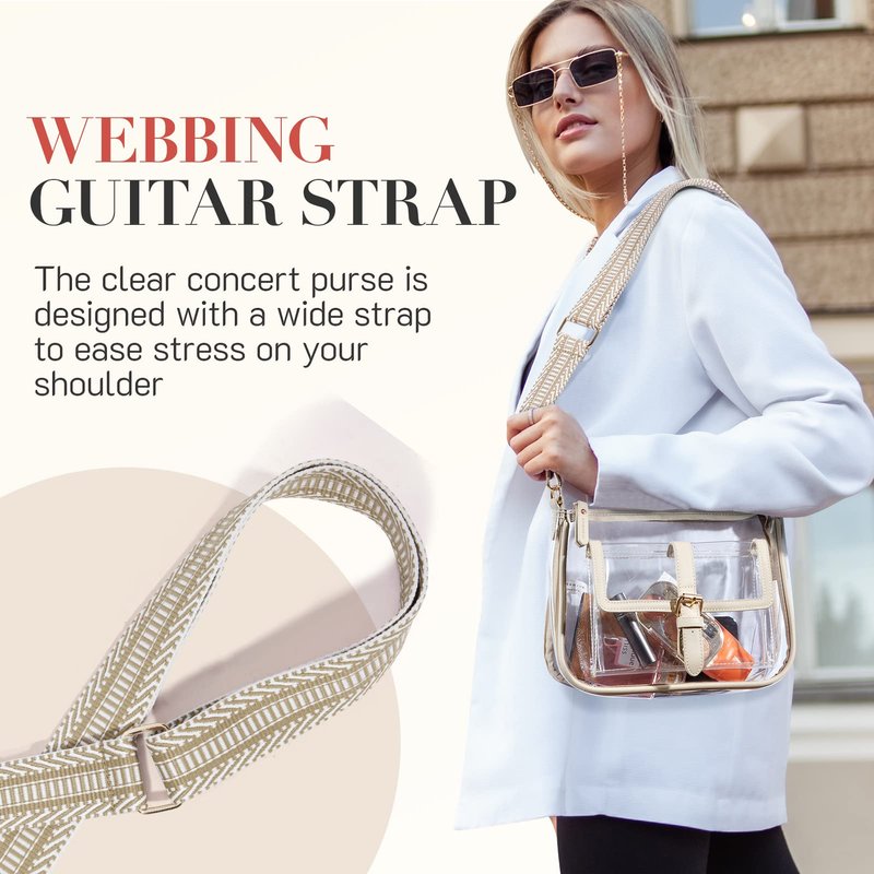 - Fashion Event Bag: Craft details such as the gold hardware and PU leather trim add sophistication and durability to this clear concert bag. A leopard/striped-print guitar strap that can be adjusted (drop is 17.7''-29.1" in length), versatile as a shoulder or crossbody bag.