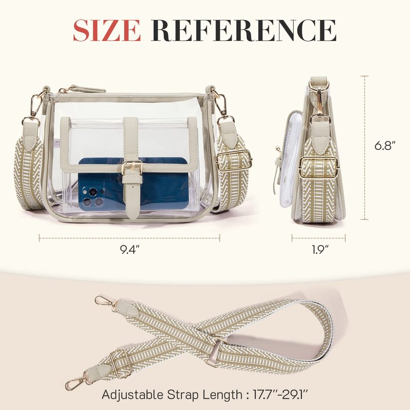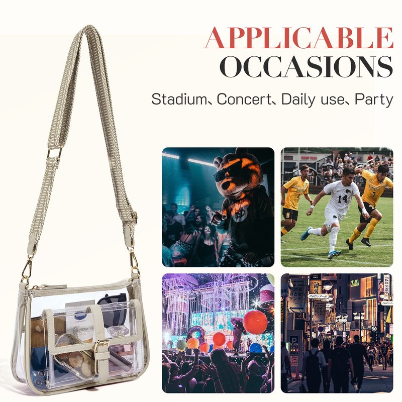 - Sturdy Clear Purse: Clear stadium bag is made of premium PVC and vegan leather, lightweight and water-resistant. Equip a webbing shoulder strap and metal hardware to make the transparent bag more long-lasting.