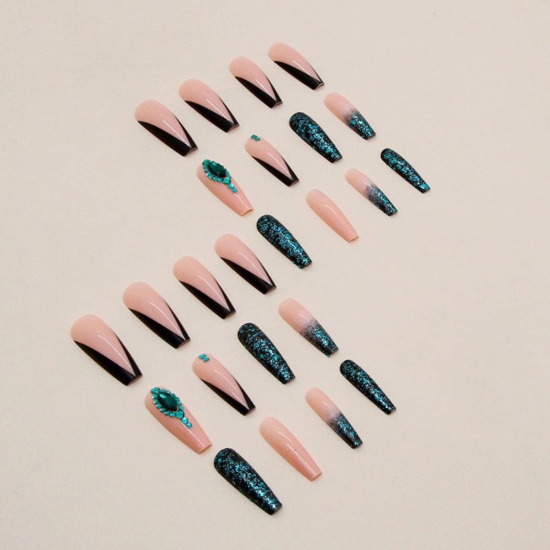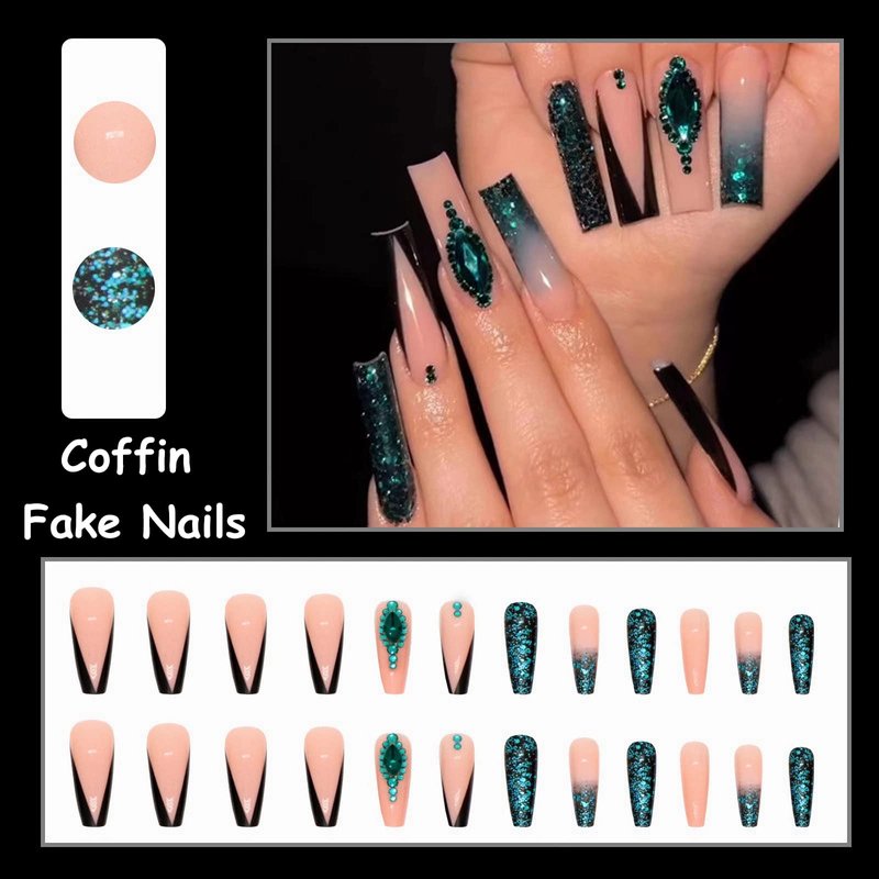 • 【Unique Design】 According to the most popular elements of the moment, these long coffin press on nails are designed with black french tip, sparkly green glitter sequins and luxury 3d emerald diamond.