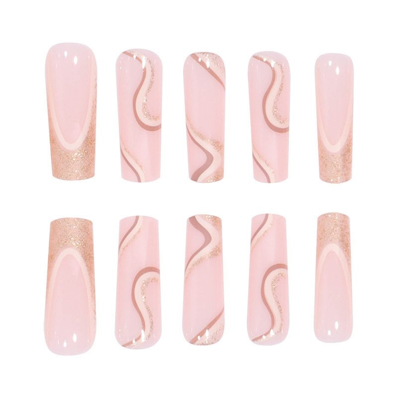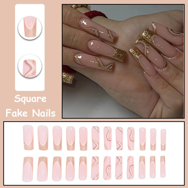 - 【Unique Design】 According to the most popular elements of the moment, these long square press on nails are designed with gold bling glitter sequins french tip and wave line.