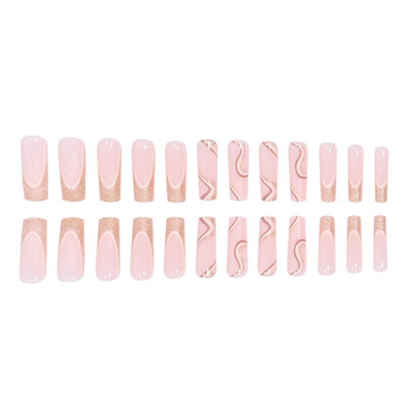 MISUD Long Square Press on Nails Squoval Fake Nails Glossy Glue on Nails Bling Gold Glitter Acrylic Nails French Tip Artificial Nails Wave Line Stick on False Nails with Swirl Design 24 pcs