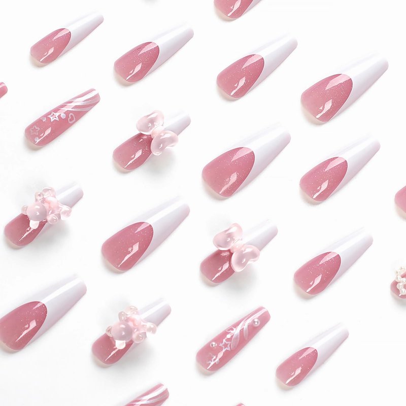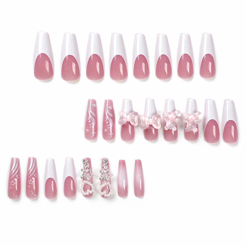 • 【Unique Design】 According to the most popular elements of the moment, these long coffin press on nails are designed with white french tip, pink gel, bling glitter, cute bow, pearl and 3d star diamond.