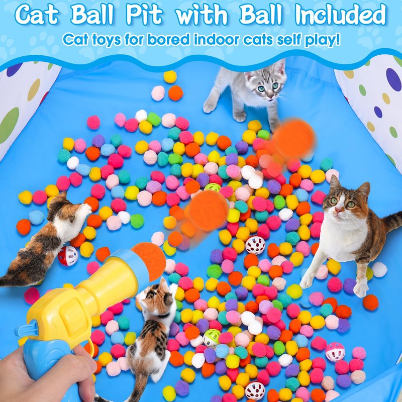 - Cat Ball Pit: This foldable cat ball pit creates an ideal indoor game place for your kittens cats, those pom pom balls and jingle balls insert bell are certain to pigue your cats interest, start swatting, pouncing and kicking, provide plenty of interactive entertainment for your cats