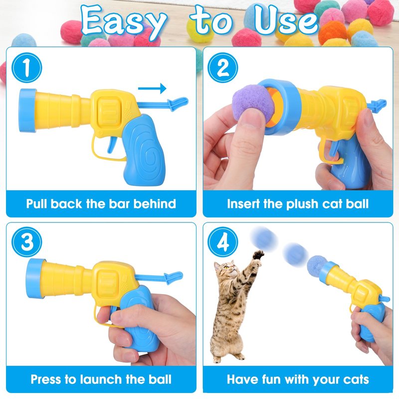- Package: Including a cat ball pit, 200pcs pom pom balls, 5pcs cat ball with internal bell, 1 cat ball launcher (pull back the level, insert a ball into the launcher and press the button, the ball will pop up)